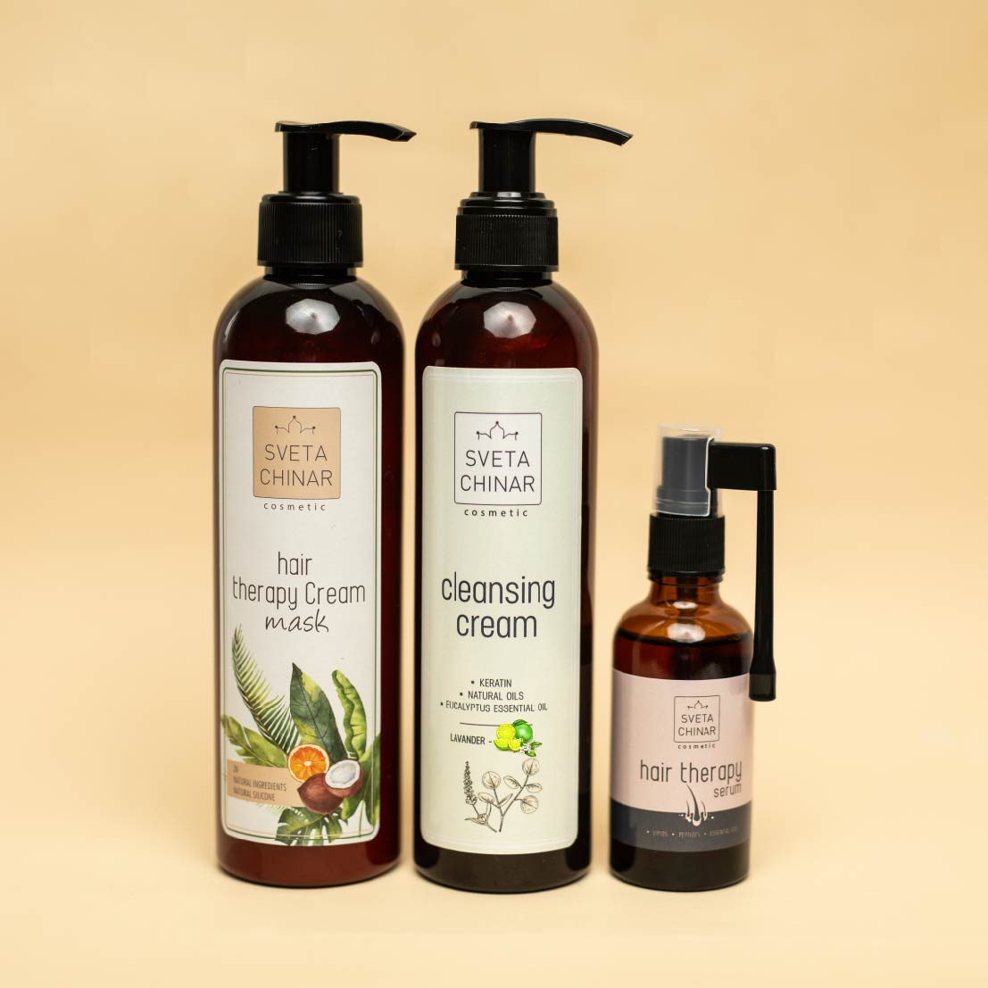 Набор для волос и кожи головы - это три средства для комплексного решения проблемы волос и кожи головы. Сыворотка для воздействия на глубокие слои будет укреплять луковицы волос, маска для волос - для восстановления кожи головы и увлажнения и питания самих волос, и конечно же мягкое очищение, которое будет не разрушать то, что было восстановлено сывороткой и маской, а мягко еще и дополнять этот уход другими полезными ингредиентами, при этом обеспечивая мягкое очищение.